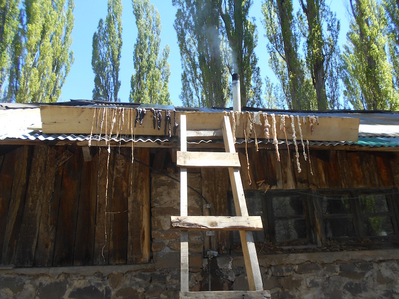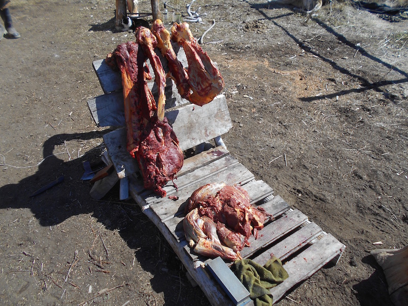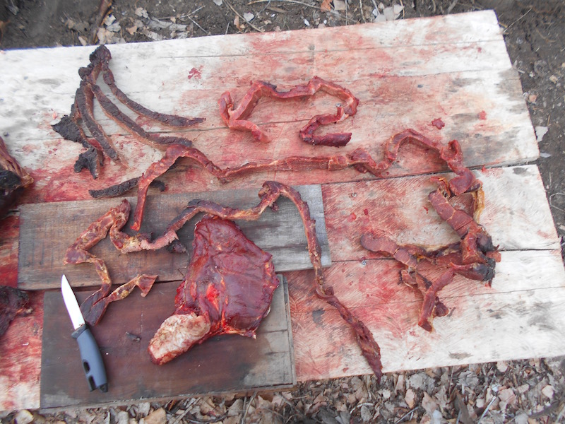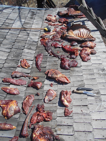 The meat was spread out initially on the roof until further processing. The sun and wind helped to start drying the meat. Putting it on the roof kept it out of reach from the cats and dogs. Luckily this was winter so there were no flies or yellow jackets around.