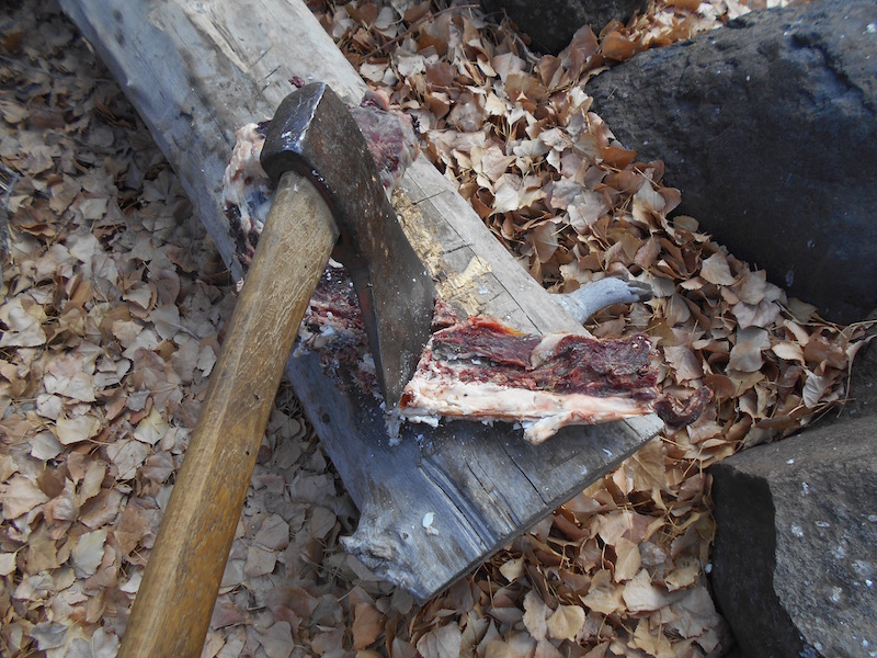 Using an axe to cut up the goat. I didn’t have a butcher saw, so I improvised.