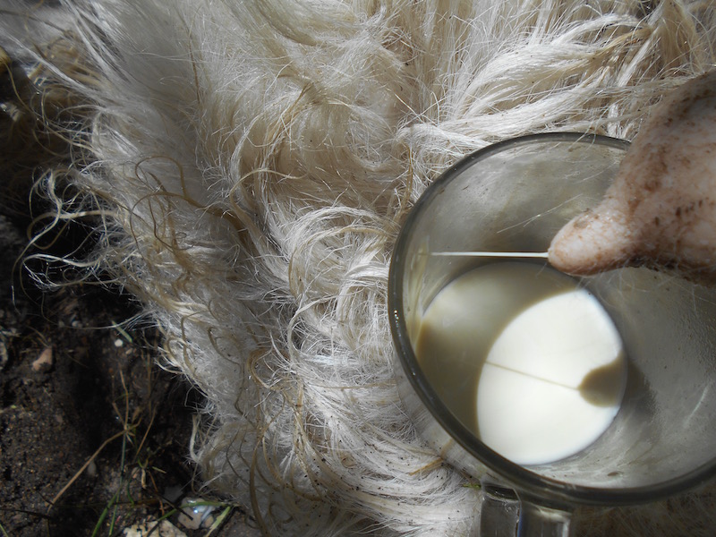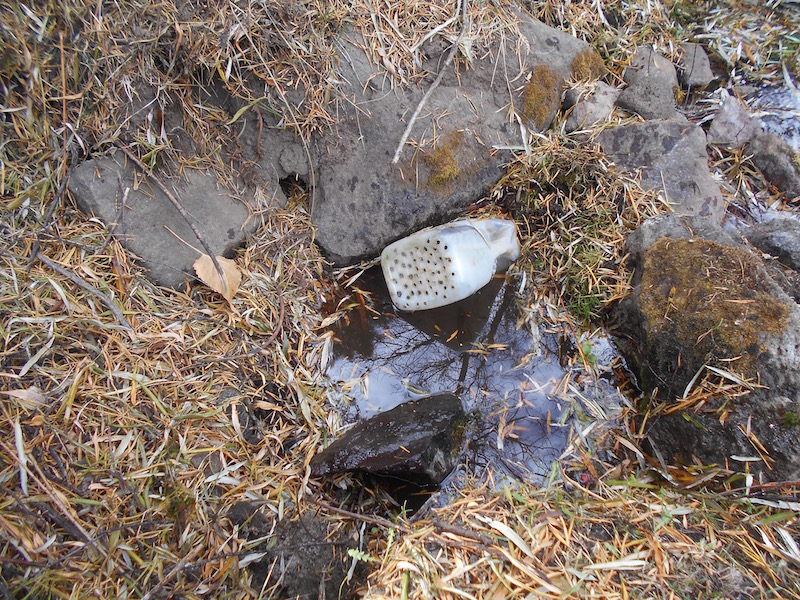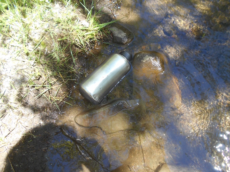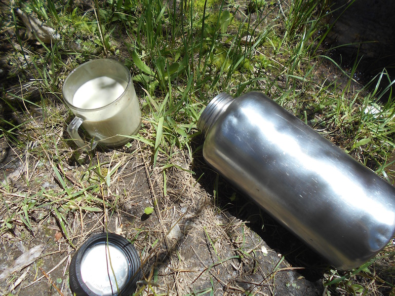 The water bottle was placed in the creek to cool. I placed two rocks next to the bottle to keep it from floating away. I obtained about 1.5 quarts (1.5 liters) of milk. The milk was really good. I hadn’t had milk for over a year so it was a real treat.