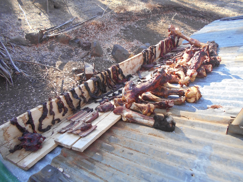 I put some boards up on the roof against a ladder and than draped meat strips over the boards. After two days I would flip and reposition the meat strips to dry the underside of the meat strip. It took about 4 days in the sun to dry the meat. There was also a ranch freezer that I was able to put a bunch of the horse meat in.
