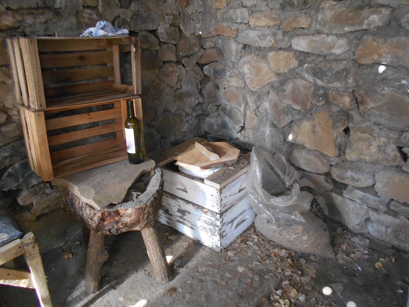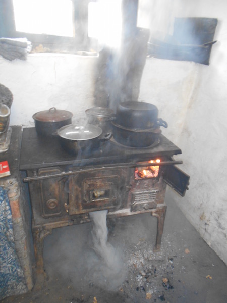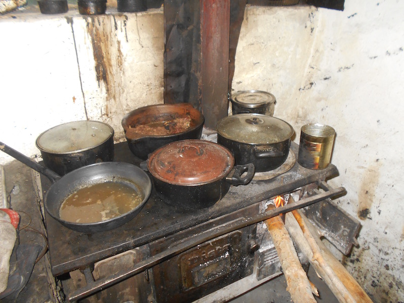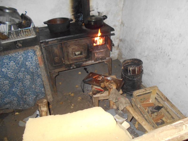 The wood-stove has a hole in the back that has streaked the wall with a dark creosote burn. Creosote buildup also dribbles down the outside of the stove pipe. The original cast iron cook plate is gone and a steel round serving dish fits in it’s place. The stove can be smoky with at least 7 points where smoke vents from the stove but at least the high level of ventilation in the building allows the smoke to clear quickly.