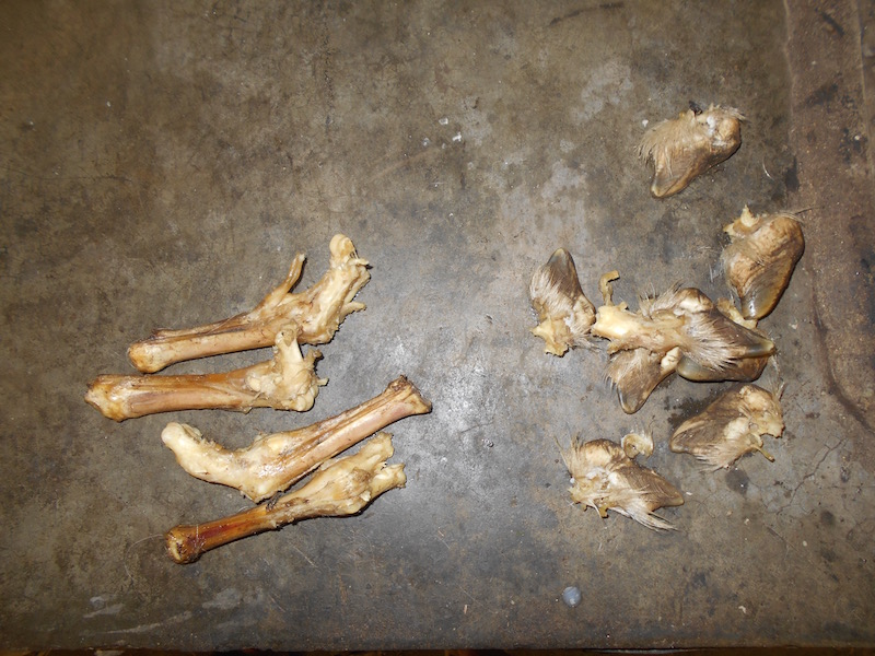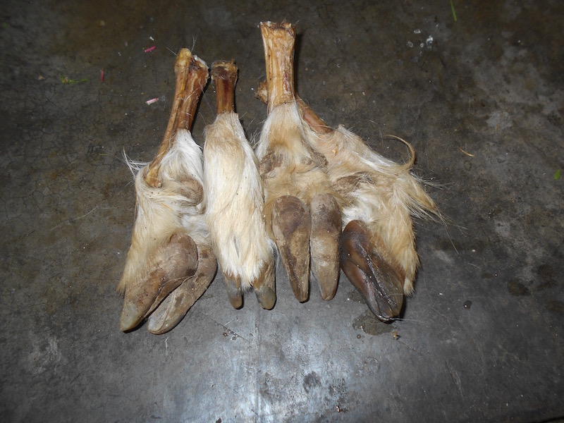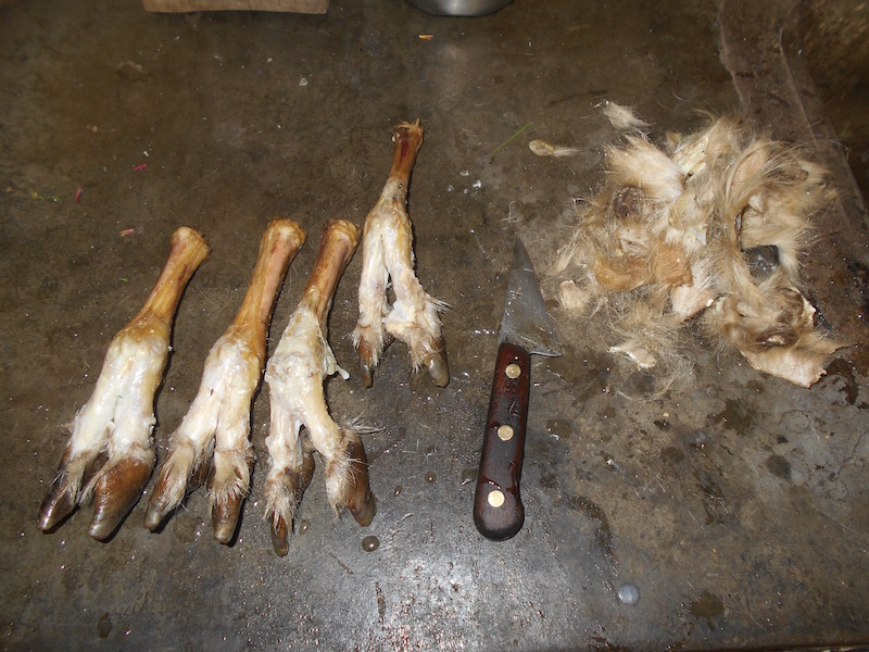 Supposedly the socket should be able to come loose after a little boiling. One can then bang them on a rock or put on a glove and pull them off. I was not able to get this to work. So I boiled them until the joint came loose. Then I made a nice bone broth with the rest of the foot, minus the hooves.
