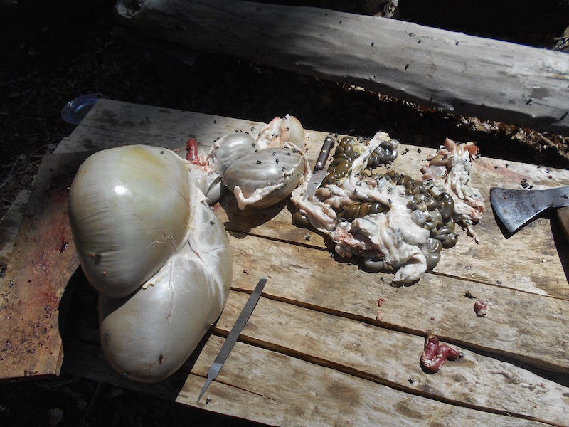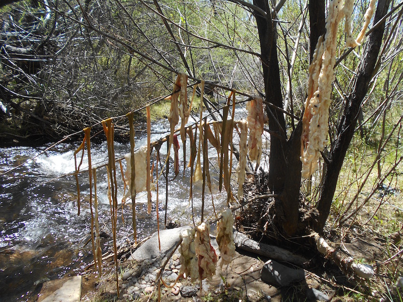 I washed out the intestines and stomach in the creek near my house. After washing each piece I hung it on a branch.