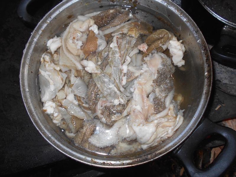 In the winter the stove is the center of activity. In this photo you will see me drying out boots that are resting on sticks (to avoid melting the rubber sole) on top of the stove. I am cooking in a pot that has two metcheros (cans burning goat fat for light) on either side of the pot. In the oven I am “baking” the moisture out of wet branches. These will be fed into the fire next. There is a log fed straight into the fire box with a pair of wool socks draped over the top to dry them out. To the right of the stove are branches that I am drying out. In the foreground is goat head stew. Up next for cooking.