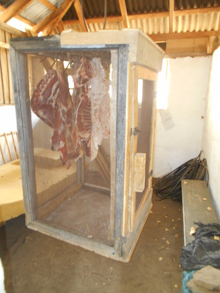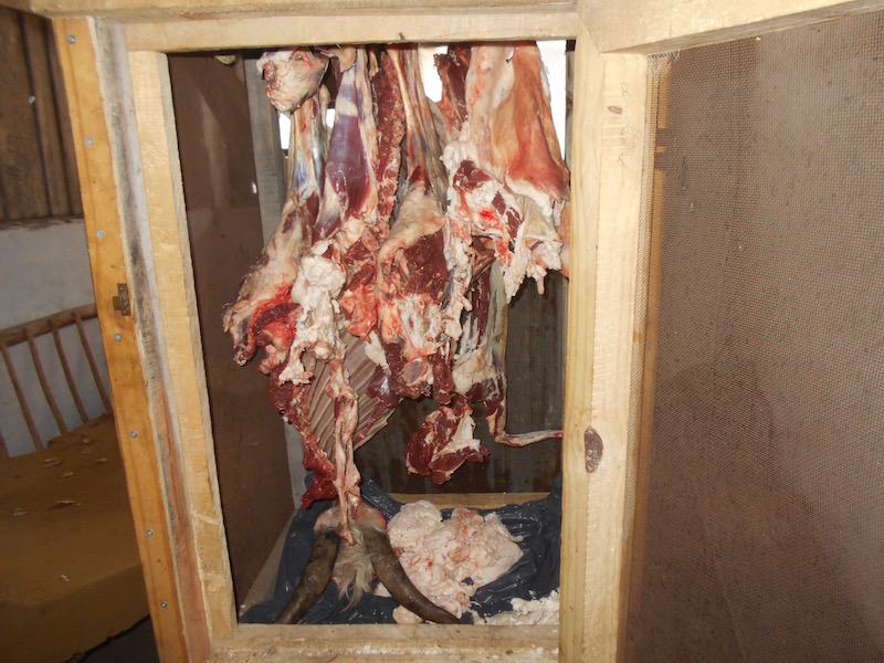 A goat carcass in a screened in cage. There was no refrigeration so all meat was kept in screened cages. Meat would last 2-3 weeks depending on the season before it became unappealing to eat.
