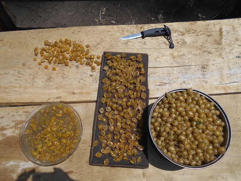 Planted trees include: apple, plum, cherry, quince, and pear. There are also gooseberries and raspberries. Many of these fruits are propagated by wildlife, so there’s volunteer fruit trees/bushes popping up around the land. There is lots of seasonal fruit.