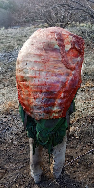 Here I am with a horse leg in my backpack and some ribs draped over my back. Horse is heavy to carry. The horses died/were killed miles from where I lived which was highly inconvenient. While scavenging the first horse, my neighbor found a cow that had died. It had been dead for a few weeks based on how dried the stomach contents were. Some animal had torn out the guts. But luckily it was on the cold side of a hill exposed to a cold wind so much of the meat was well preserved. The beef was surprisingly excellent. Some of the best I ever ate.