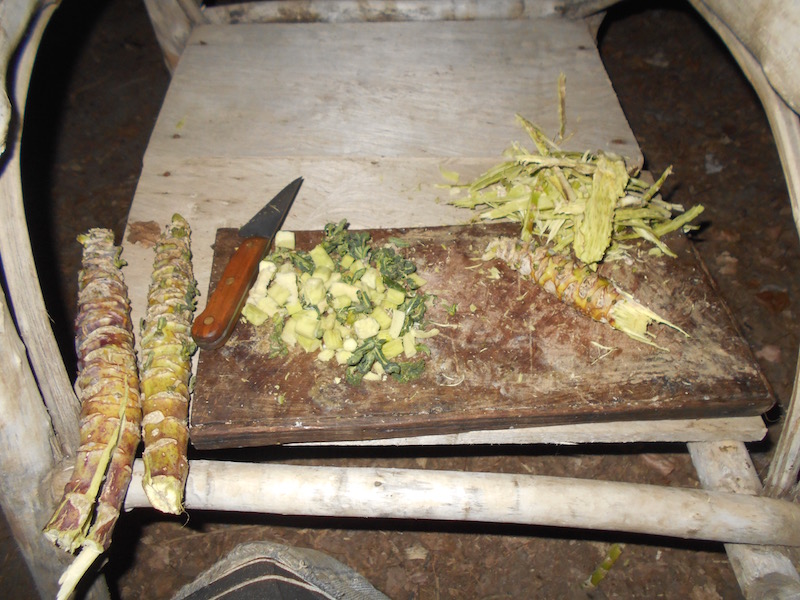 Here I am cutting up the last of the vegetables. These are stems from collards and kale plants as the greens were already eaten. After these vegetables, I ate only two things for a couple of months: rose hips and meat.
