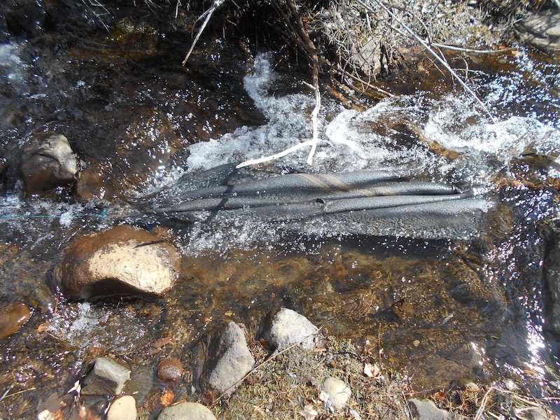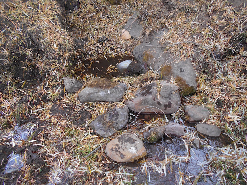 The water systems at the estancia are simple. A particle filter (plastic bottle with holes) for sediment is slipped over a plastic polypropylene pipe and placed behind a small dam. Honestly, this pre-filter was only good for keeping out leaves. It would let small stones, sand, and other sediment into the water line. This later became a problem as the flow of the water in the line slowed down due to sediment buildup. When building a water system be sure to use a much finer sediment filter for your water intake point. If particles get into your line, you want the particles to be small enough to be carried through the water line from the gravity flow of the water moving through the pipe.