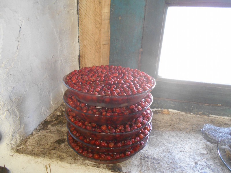 I wore gloves to harvest the berries because they have these very small thorns on the fruit that get stuck in the hand and are irritating. Then I shake the dried berries in a colander to knock off the little thorns and debris.