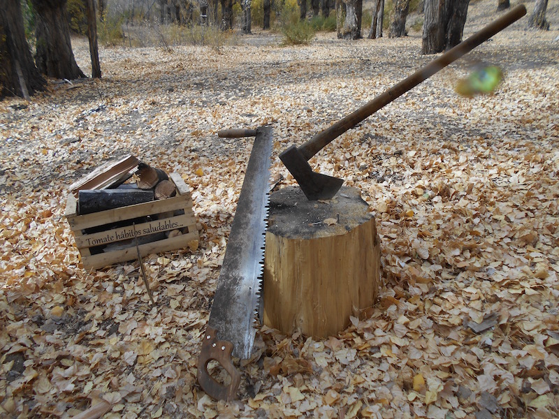 Making and stocking up on firewood was an essential task. I had a crosscut saw and axe for processing wood. Initially I used these tools more frequently. But I realized how much energy was required to cut each piece of wood by hand.