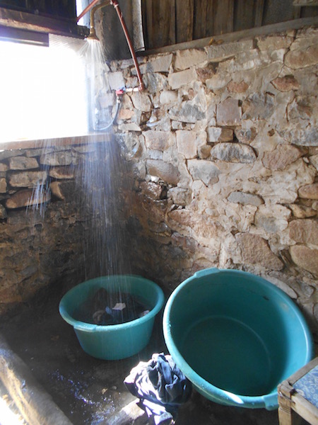 I hand-wash my clothes. In this photo I am filling up plastic tubs with water in the shower. Then I will proceed to “dance” in the tub to agitate the laundry in the water. After a few minutes of this, I dump out the dirty water, squeeze out individual clothing articles and set them aside. Then I put the clothes back in the tub and refill it with water. I usually repeat this cycle about 8 times before I decide that the clothes are sufficiently clean. Initially I was using hot water from the water heater to do laundry but this used up a lot of wood and was a lot more work. So I switched to washing in cold water most of the time. If a specific clothing article felt greasy or was not getting as clean as I wanted it, I would put it in a pot on the stove with some soap and boil it for awhile. This cleaned the clothing quite well but was only used a few times over my nine months in this house.