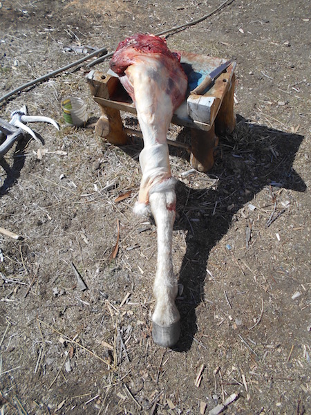 Skinning a horse leg. Mixed with the hauling was preparation of the meat for preservation.