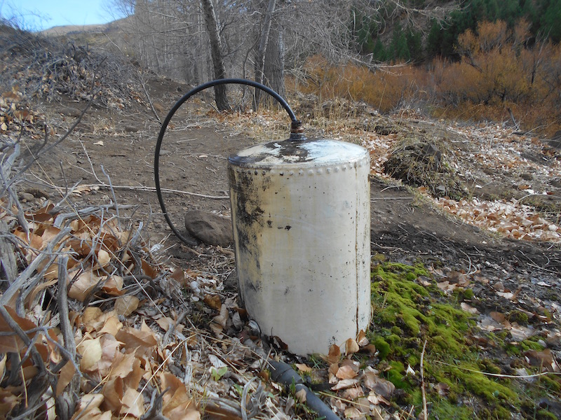 From the spring, water is gravity fed down to a small tank. This tank sits uphill from the house and provides a small amount of stored water for showers, etc. The tank is continually filled and overflows out the top.