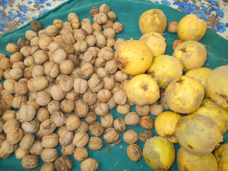 Walnuts and quince fruit. I learned that quince can be eaten raw.