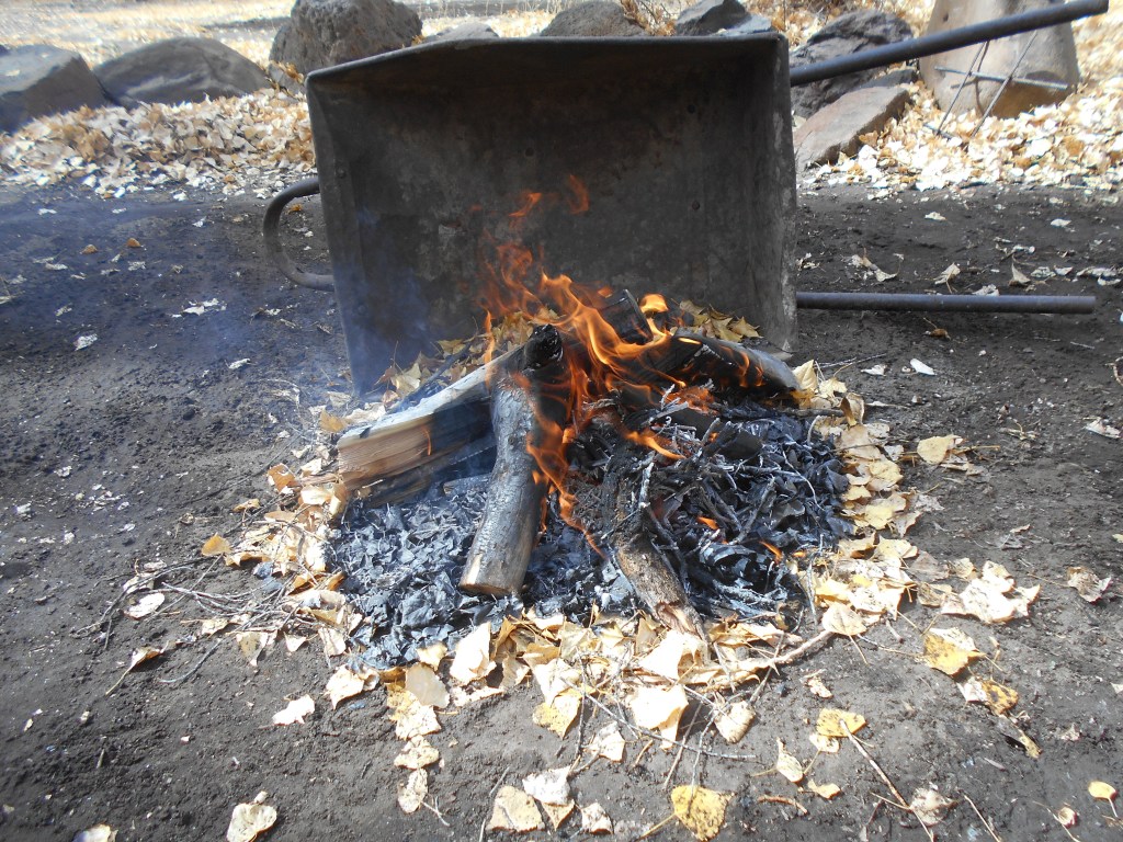 Don’t put the flame directly below the meat. You want the flame adjacent to the meat. Use a heat reflector to direct the heat to the meat for cooking. In this image I am using an old wheel barrow to reflect the heat onto the meat. Alternately, scrap metal roofing, sheet metal, rocks, etc. work well.