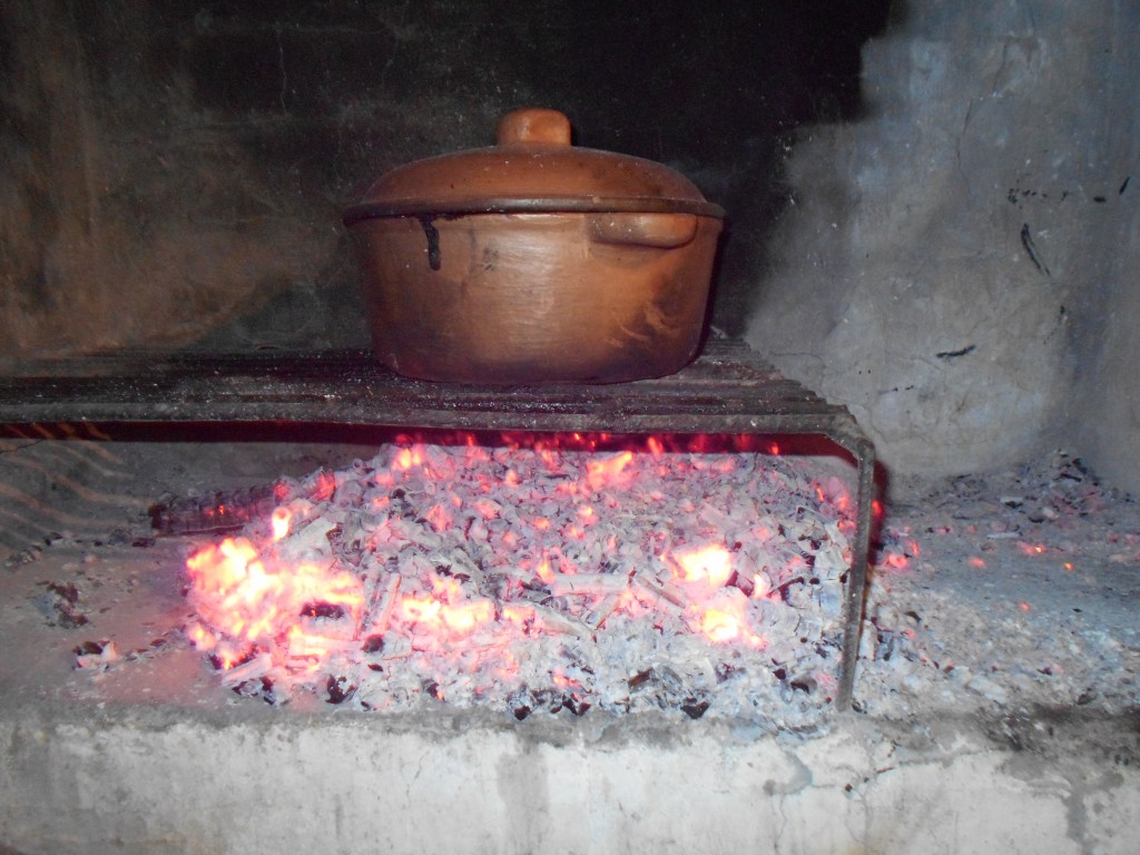 This is an unglazed clay pot that I bought for about $13 new. It is sitting on a grill with the fire adjacent to it.