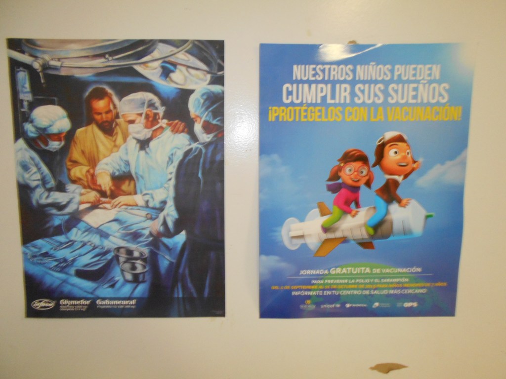 The poster on the left shows Jesus guiding the hand of a surgeon. It is an advertisement by a drug company using religious imagery in a highly Christian society.