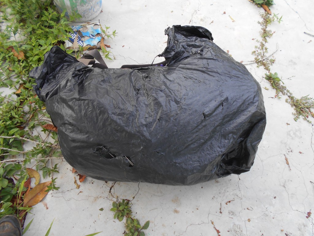 The plastic bag both protects the pack from some rain and hides the new/expensive mochila.